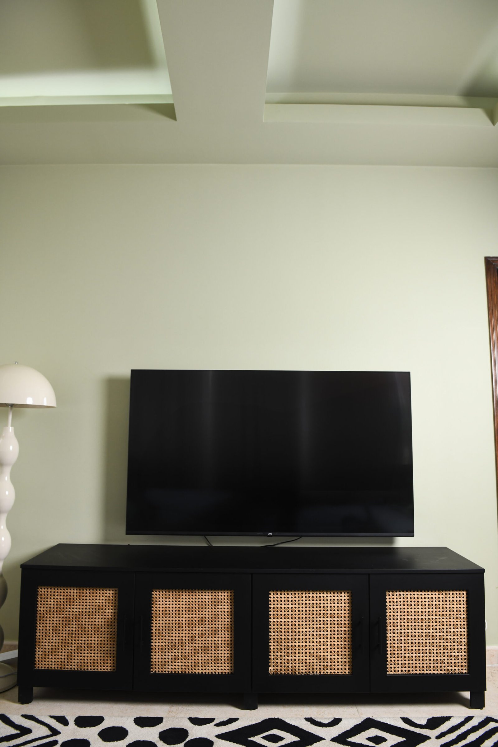 Compact media console with four arched cane doors in matte black; adjustable shelves and rear cable ports.
