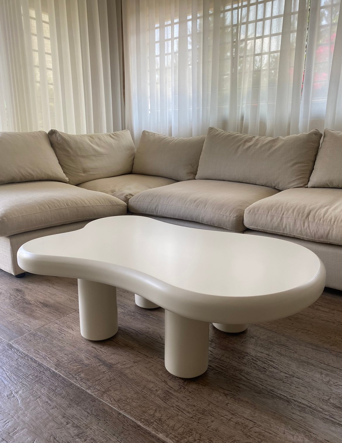 Organic cloud‑shaped coffee table with rounded bullnose edge and cream satin finish.