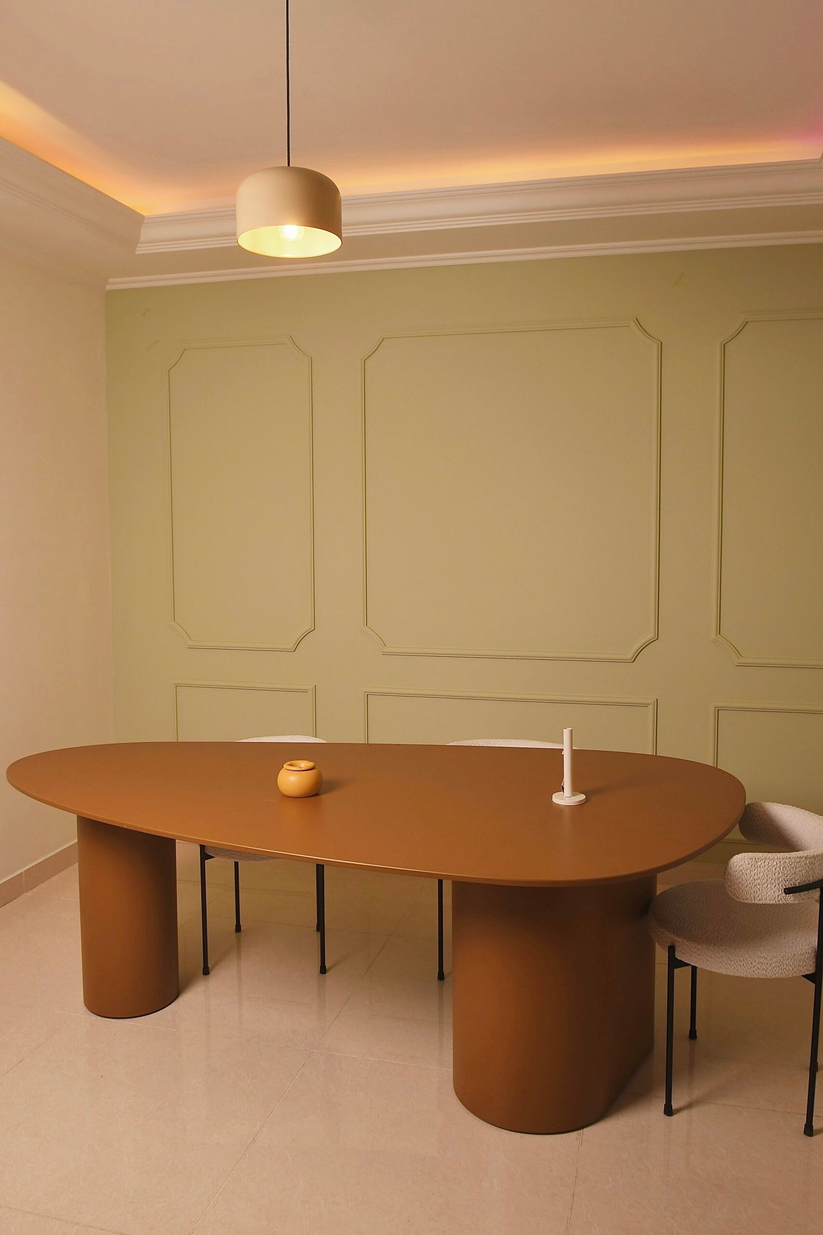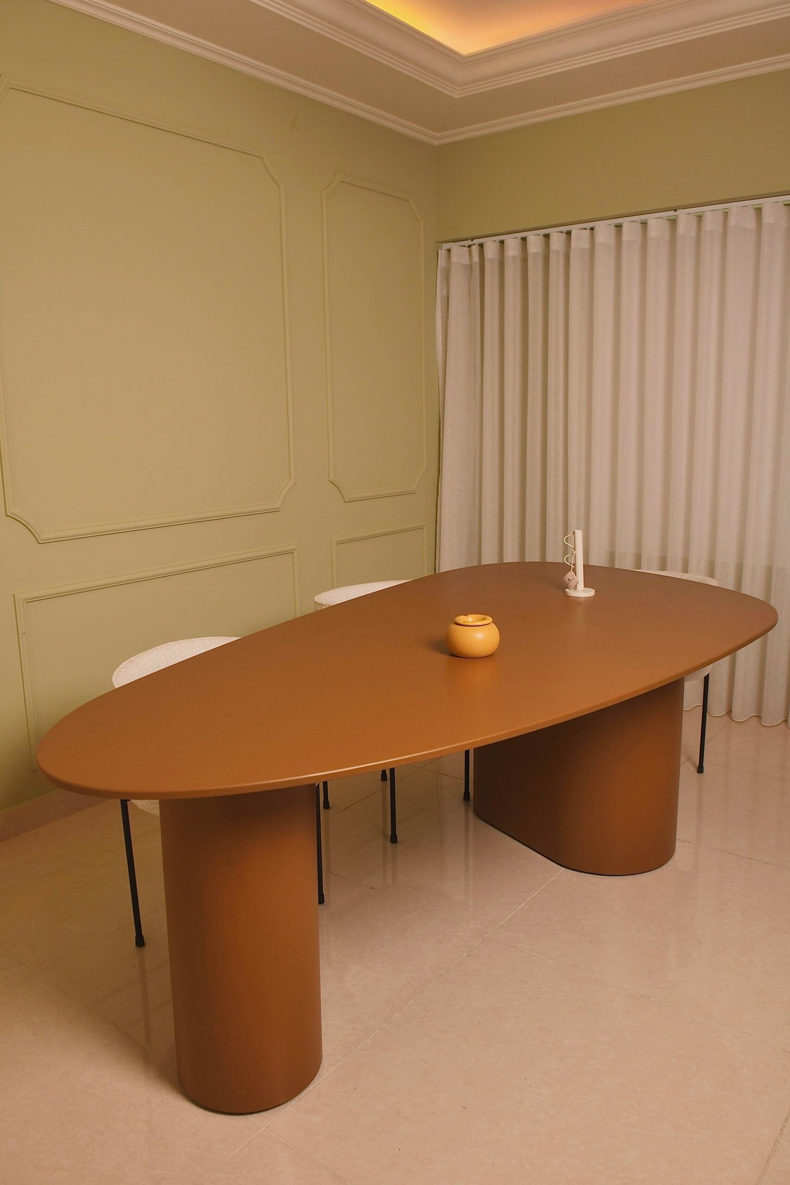 Monolithic oval dining table on two rounded pillar bases in rich umber finish.